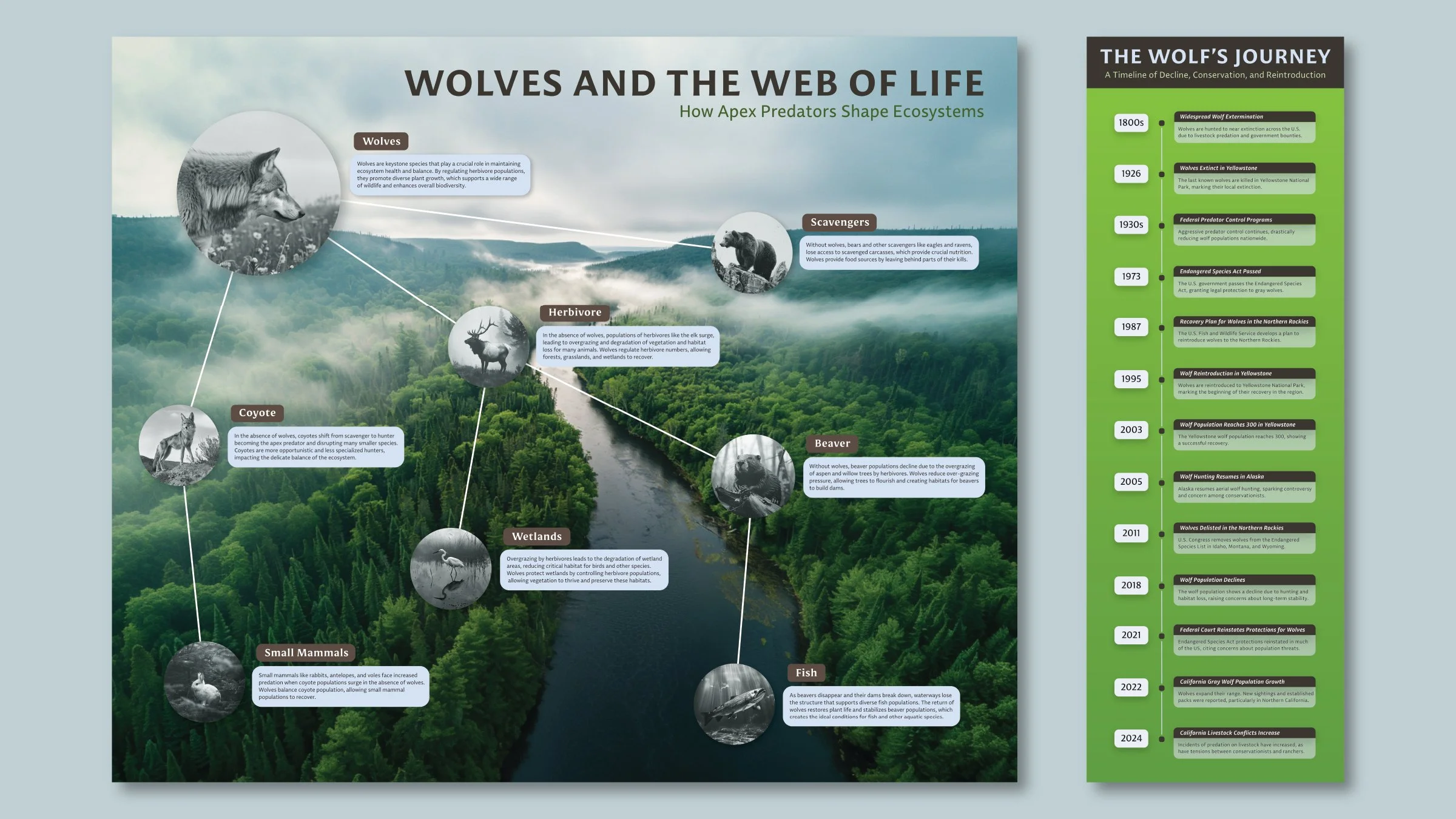 Infographics: Designed to explain the historical context of wolf extermination and their ecological importance, these visuals emphasize the species’ role in maintaining balanced ecosystems.