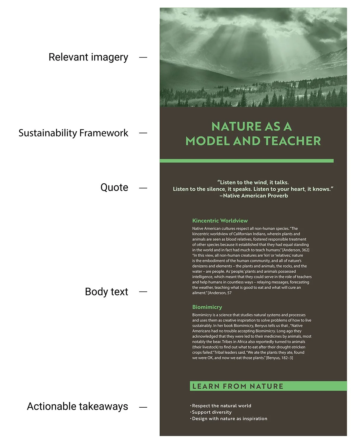 Six panels were designed to present text written by Sustainable Design Professor Barbara Sudick, visually harmonized to align with the exhibit’s style guide. Each panel is color-coded to its principle with panel headlines match their assigned color, and black-and-white images at the top of each panel are tinted with a low-opacity overlay of the same hue.Mocked-Up Exhibit Space: